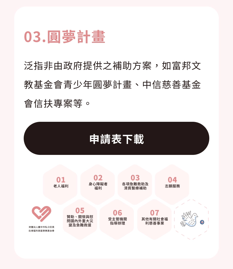 113年【平安惜福傳愛活動月】公益活動-影片紀錄113年【平安惜福傳愛活動月】公益活動「平安惜福傳愛活動」是希望透過物資捐贈與貼心的陪伴服務,滿足弱勢群體的基本需求,並傳遞社會的溫暖與愛心。我們基金會不僅關注物質幫助,同時更重視精神支持,透過與受助者的互動,建立尊重與關懷的橋樑,讓每一份資源都能發揮最大的價值,讓每個參與者都能感受到助人的快樂與意義。平安惜福傳愛活動月今年我們再次推動「平安惜福專案」,結合中元普渡的精神,幫助社會弱勢。此次我們募集到麵線、鳳梨酥、燕麥片以及成人尿布等物資,送至中華民國善願愛心協會等單位。透過提前調查需求,我們確保每一份捐助都能發揮最大價值,真正送到需要的人手中。這不僅是物資的分享,更是愛心的傳遞。走訪日期走訪地點第一站2024年8月10日迦南康復/精神護理之家第二站2024年8月11日雲林偏鄉關懷第三站2024年8月15日南投仁愛之家 兒少家園/長照家園第四站2024年8月19日台中社會局北區家庭福利服務中心第五站2024年8月22日台中惠明盲校第六站2024年8月31日善導書院第七站2024年9月1日善願愛心協會113年平安惜福傳愛活動月113年平安惜福傳愛活動月-物資募集攜手傳善・鞋力植福在探訪迦南康復之家後,發現多數住民(意指機構內身障者,以下統稱「住民」)需要更換鞋子,過去多依賴二手鞋捐贈,但缺乏精神復健的功能。「鞋力植福」活動不僅是贈鞋,更是一次充滿意義的陪伴,讓捐贈超越物質本身,成為住民與社區互動的一部分。在這過程中,我們看到的不只是住民穿上新鞋的喜悅,更是他們重新融入社會的信心。這項活動體現了引善、共善、永續的理念,讓愛心成為持續推動公益的動力。攜手傳善・鞋力植福未來展望-攜手讓愛無限延伸無論是平安惜福還是鞋力植福,每一份善行都來自社會各界的支持與協助。未來,巨美慈善基金會將繼續透過深入了解需求,整合社會資源,推動更多溫暖人心的公益專案,為需要幫助的人創造更多美好的可能性。感謝共善廠商的支持鞋全家福埔里店大同3C五權門市媽媽寶寶南平店三風食品工業股份有限公司台糖公司商品行銷事業部台中營業所康那香企業股份有限公司丰丹嚴選本舖宇翔有限公司大樹藥局-台中建國店味宏食品行花蓮小農刷樂國際股份有限公司思想家網路行銷公司(影片製作)