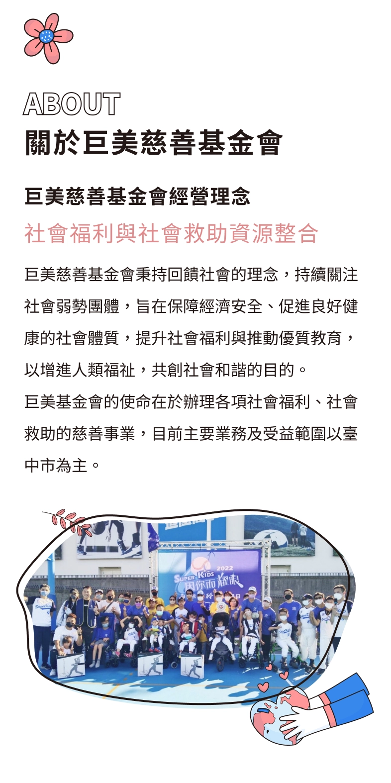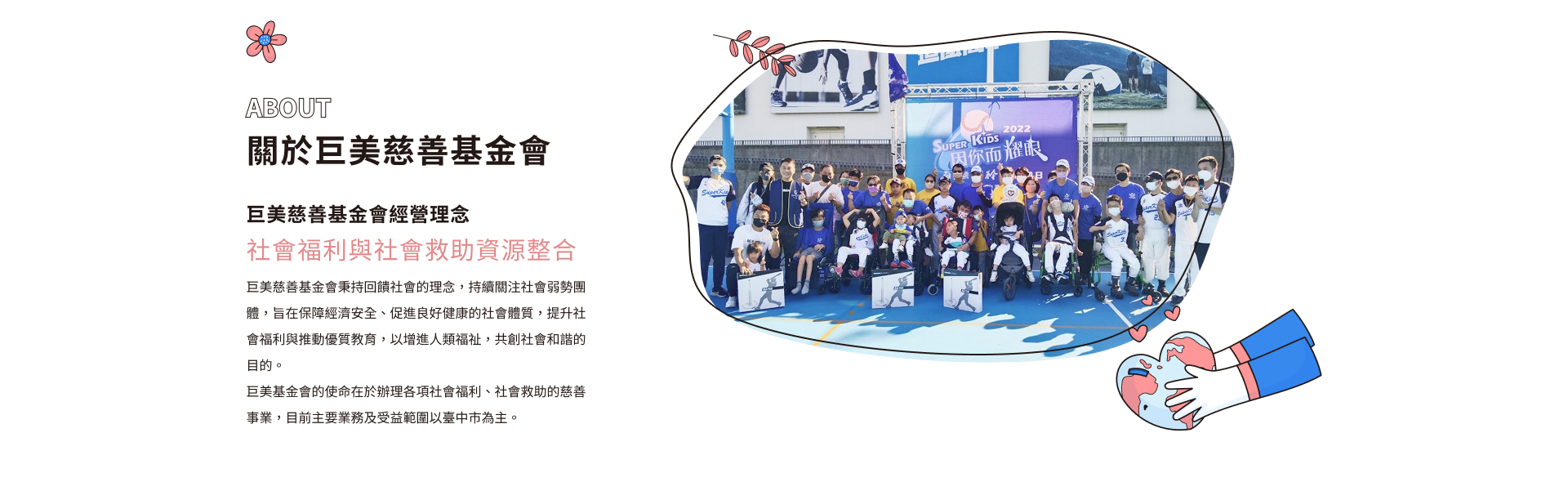 2022年 Super kids 因你而耀眼 勇敢挑戰,因愛不怕礙,你我人人皆正常!由「Super kids勇敢小超人棒球隊」主辦,台灣迪卡儂有限公司、財團法人臺中市巨美社會福利基金會和巨宇翔企業(薡茶)共同協辦的「Super kids因你而耀眼-有愛無礙棒球體驗日」,2022年12月3日在台灣迪卡儂南屯店舉行。感謝 中華職棒樂天桃猿Rakuten Monkeys 88 藍寅倫 大力支持,讓愛藉由活動發光發熱!Super kids因你而耀眼 - 有愛無礙棒球體驗日特殊需求兒童因為生理疾病、肢體動作功能受到限制或是認知能力不足等因素,無法參與常規之體育活動,藉由資源連結,邀請社會大眾愛心支持心願禮物,鼓勵特殊需求兒童更有勇氣克服身心理的障礙,展現生命的堅強、學習不放棄之運動精神。感謝參與活動的愛心志工們!現場特殊需求兒童需要更大的心力支持,每一次的練球都會邀請一般小朋友協助,讓特殊需求兒童感受到社會正向的溫暖,以及同儕間強大的支持力量,雖然自身肢體不便,但依舊熱情示範與引導民眾完成體驗活動,此舉完美展現社會共融的目的,相信這次體驗活動會讓特殊需求兒童在未來人生旅途注入更多能量!一路走來,因為有引善、共善及永續的信念,將我們凝聚在一起~很幸福也很感恩!期盼希望,未來能繼續攜手共伴、持續扶持向前行~「Super kids因你而耀眼 - 有愛無礙棒球體驗日」紀錄照2022年 Super kids 因你而耀眼 勇敢挑戰,因愛不怕礙,你我人人皆正常!2022年 Super kids 因你而耀眼 勇敢挑戰,因愛不怕礙,你我人人皆正常!2022年 Super kids 因你而耀眼 勇敢挑戰,因愛不怕礙,你我人人皆正常!2022年 Super kids 因你而耀眼 勇敢挑戰,因愛不怕礙,你我人人皆正常!2022年 Super kids 因你而耀眼 勇敢挑戰,因愛不怕礙,你我人人皆正常!